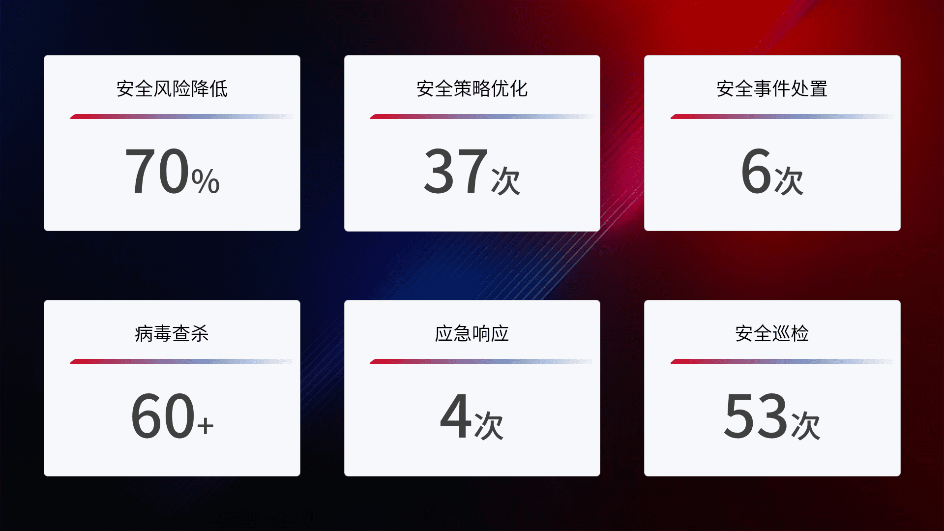 提供全面的安全事件报告体系,,,包括处置报告、、周报、、、季度和年度总结,,,结合持续监控,,帮助客户深入了解网络安全状况。。。