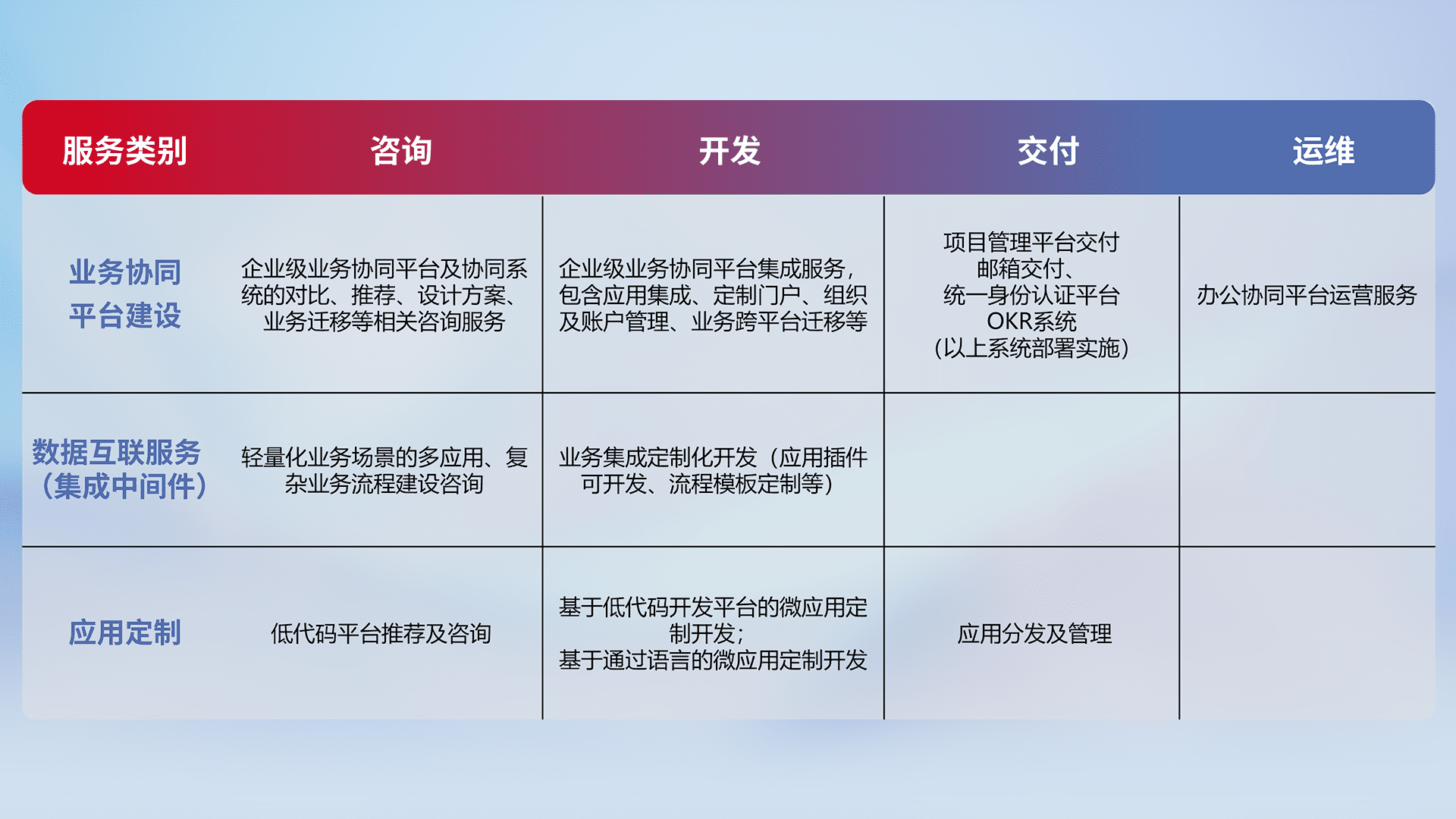针对钉钉、、、、企微、、、IDaas等平台级产品提供产品的规划、、、方案、、交付、、定制化开发等服务,,,,实现如统一协同办公、、、智能客户服务、、、、混合会议管理、、、、智能数据查询、、、等业务场景,,实现数字化转型。。。。