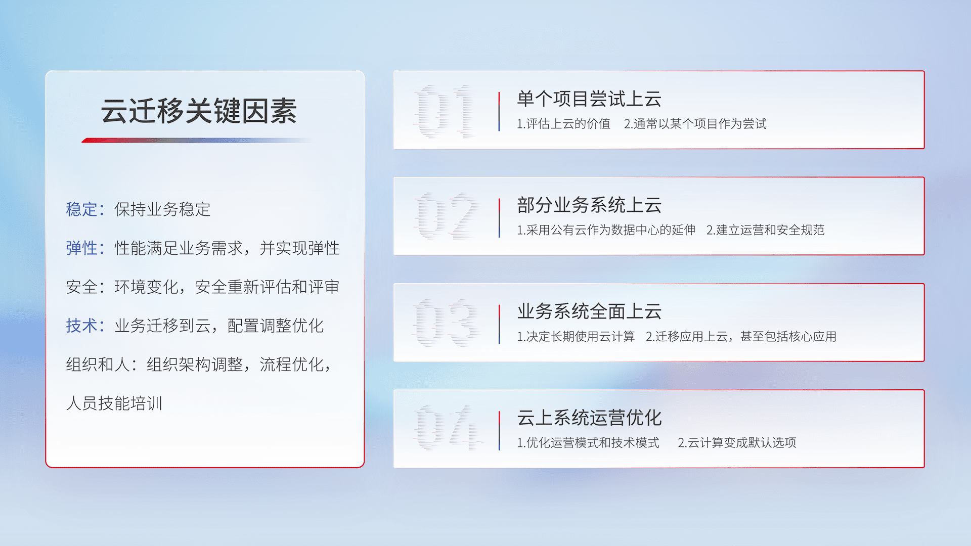 结合实际业务,,,从规划设计、、、云平台选型、、、云原生改造、、数据迁移、、、、集成交付,,,,迁移全过程为客户识别最佳上云路径,,,做好风险识别管理,,设计网络架构、、、身份权限、、安全审计合规、、、操作审计、、日志审计、、监控告警策略、、、多站点容灾设计等,,,对云上基础设施进行整体规划,,,,提升IT治理水平,,,,以满足弹性、、、高可用、、高性能的需求。。。。