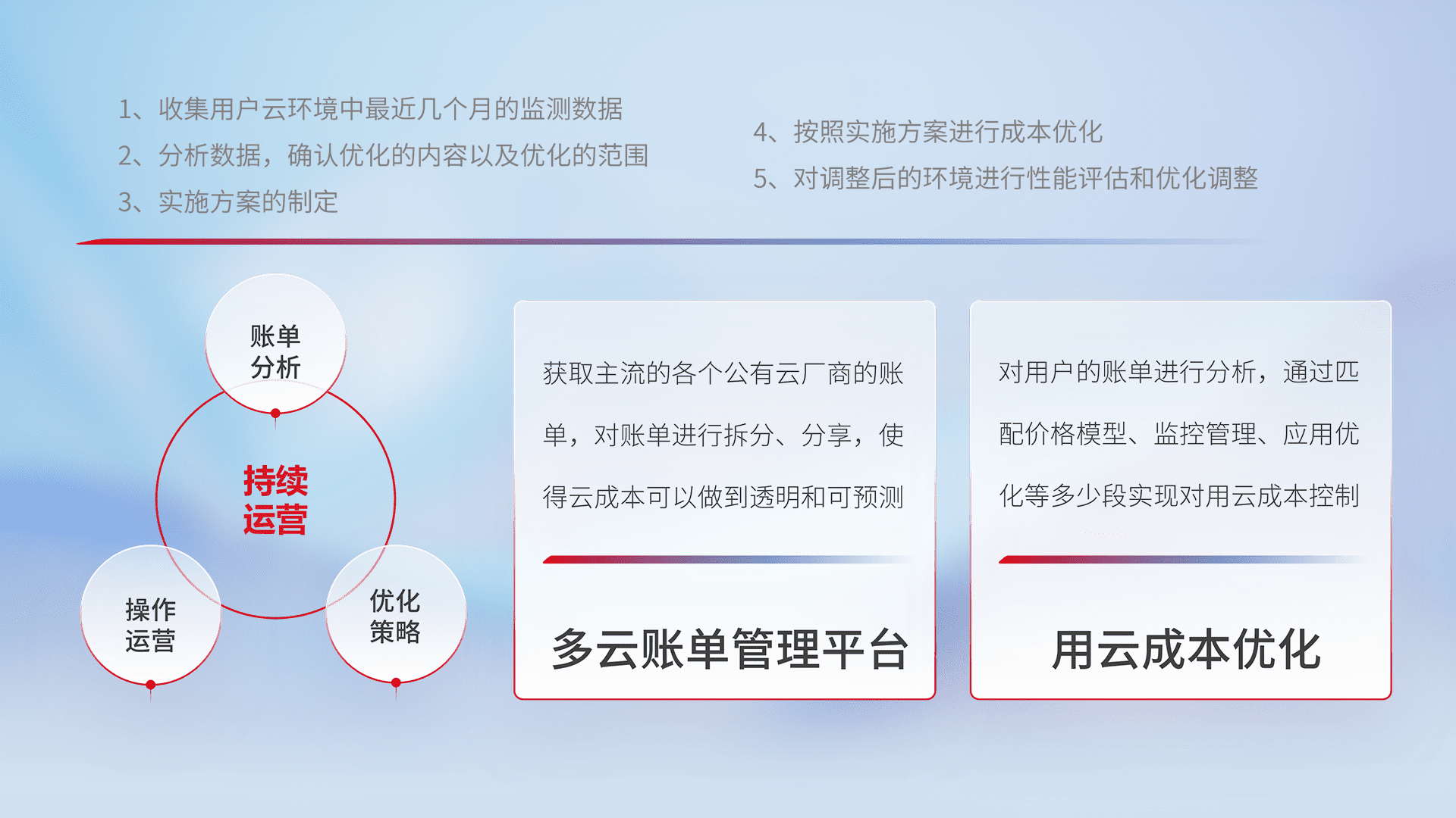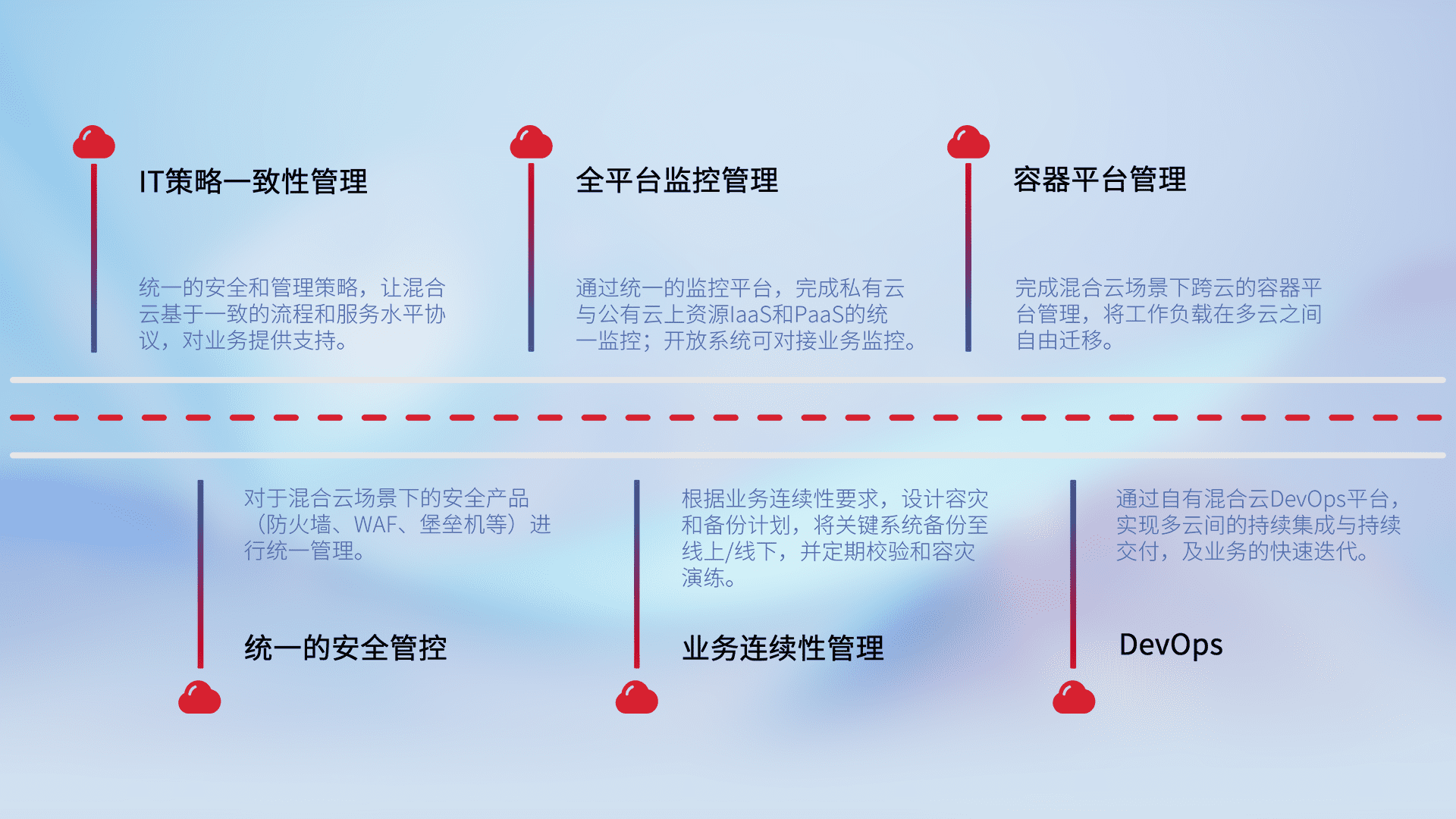 通过多云纳管,,以统一的资源数据模型把客户的云资源进行抽象和封装,,,进而实现对多云资源的统一操作,,,,保障云资源管理的可靠性、、稳定性与可用性。。。量身定制化运维内容,,,,配置、、开发运维、、、、补丁管理、、、、备份、、、监控、、认证和访问管理、、、、审计和日常巡检等,,保障在用云过程中的可靠度,,,稳定度以及高可用率。。